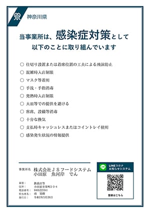 当店では感染症対策として、神奈川県感染防止対策取組書に記した以下の形で取り組んでおります。